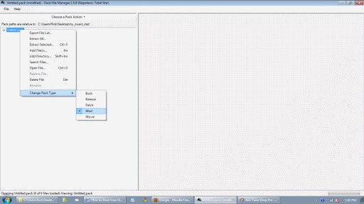 This will add the directory, sub-directories and .mp3 files you changed as well as the ones you did not. We are almost through! Next we need to change the pack type to mod. We do this by right clicking on our untitled.pack which will lead to a drop down menu, and we will select Change Pack Type which brings up another menu, and we will select Mod.
