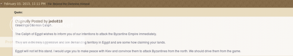 The Caliph desires peace and was forced to take these actions to stop an unrelenting assault by these so called holy warriors. To prove our intentions toward peace diplomats have been dispatch to the Caliph of the Seljuks and the Basileus of the Eastern Roman Empire. The Caliph wishes for there to be peaceful trade and is willing to sign a non-aggression pact for 20 turns (negotiable) if the leaders of these kingdoms are willing.