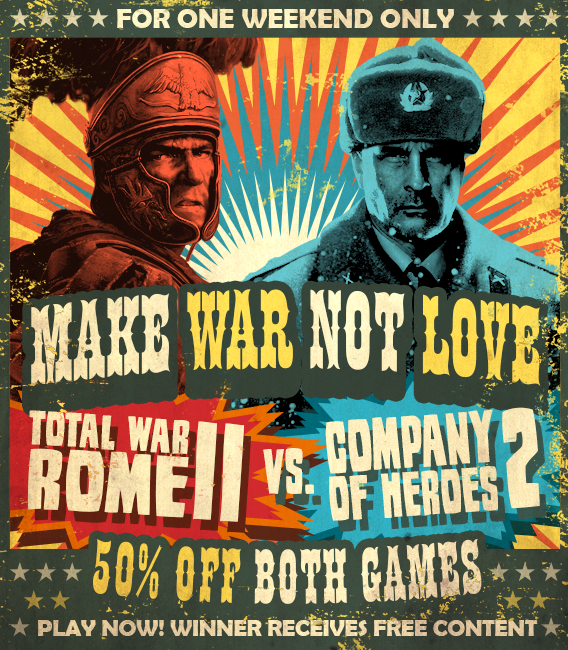 SEGA presents the heavyweight bout they said could never happen as two giants of the strategy game genre throw it down for a dirty Valentine’s weekend battle exclusively on Steam! Relic’s Company of Heroes™ 2 and Creative Assembly’s Total War™: Rome II players will face off in the Make War Not Love promotion with the winning community earning their chosen game some brand-new free DLC for five days.