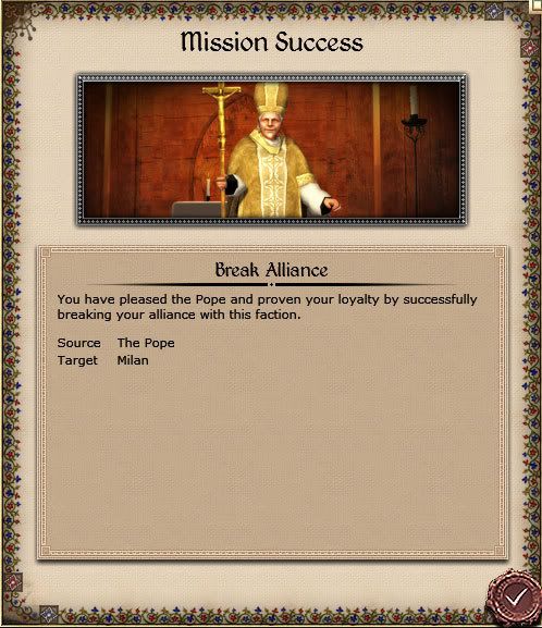 | break_alliance | Break Alliance | In uncertain times like these, it is important to know who one's true allies are. The Pope demands you break your alliance with this profane and heretical faction to prove your loyalty. | As this faction has perished, you are no longer required to break your alliance with them. OR Your faithless faction has been excommunicated. You are no longer required to break your alliance with this faction. OR As this faction has returned to the fold and been reconciled, you are no longer required to break your alliance with them. | You have pleased the Pope and proven your loyalty by successfully breaking your alliance with this faction. | His Holiness can only wonder what went wrong; you have disappointed the Pope by failing to break your alliance with this faction. |