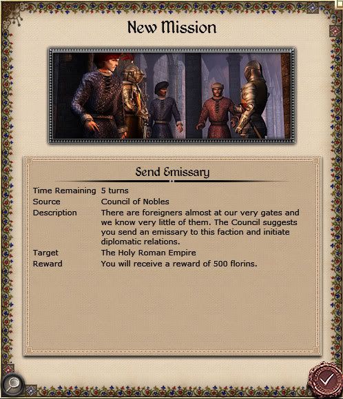 | send_emissary | Send Emissary | There are foreigners almost at our very gates and we know very little of them. The Council suggests you send an emissary to this faction and initiate diplomatic relations. | The faction you were to meet with has been vanquished. There is no longer a need for you to send a diplomat to them. | Congratulations, you have successfully established diplomatic relations with these people; the Council admires the ease with which you handle diplomacy. | You have failed to establish diplomatic relations with these people, the Council hopes this is for the best. |