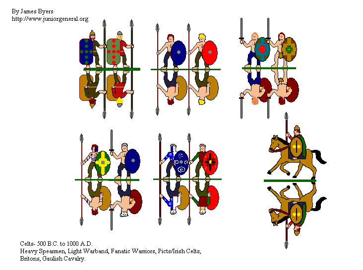 Hey guys, check out this website. http://www.juniorgeneral.org The goal of the site as they say on their homepage is to... "...promote the use of historical simulations as a tool for teaching history by providing free resources that anyone can use...." They make little counters that can be printed and cut out to recreate battles from all over history, and yes, there is a considerable lot for ancient history alone. Some samples. Alexander's Macedonians Celts There is also a "blanks" gif that you can copy and paste to make your own soldiers with Paint.