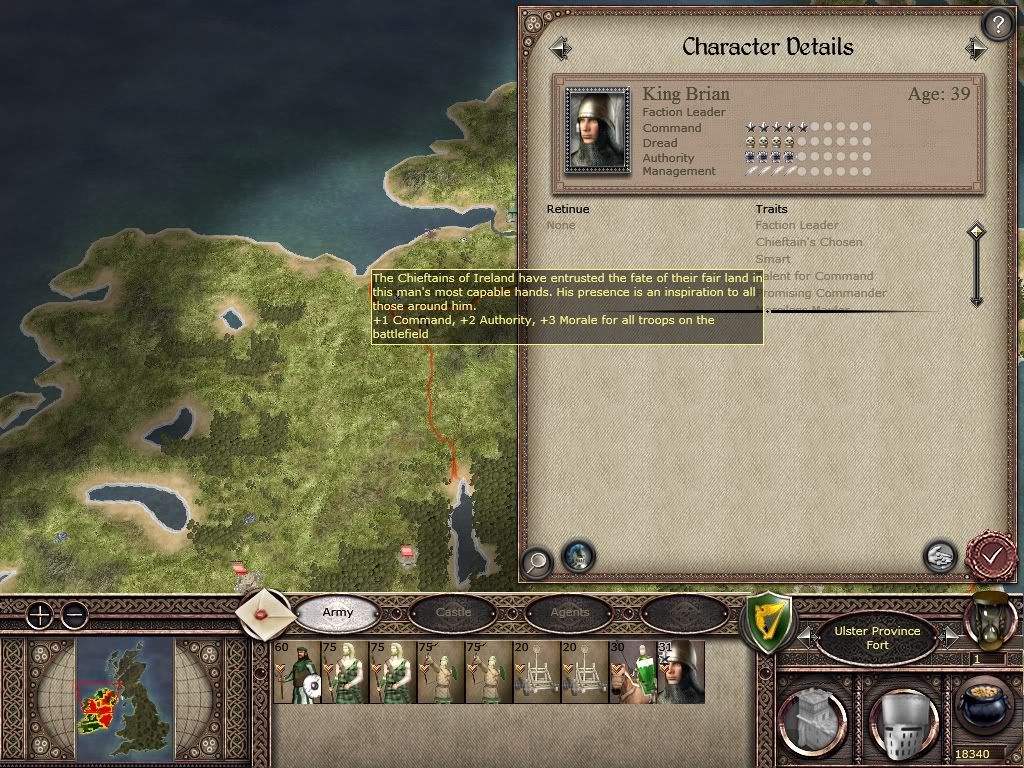 King Brian has assembled an army and has begun a march on the northernmost city in the possession of England on Ireland, the city of Derry. His host consists of many sword- and spearmen, as well as several units of archers, little cavalry, and four catapults to assault the walls. When he reaches the city, he should have very little trouble capturing it.