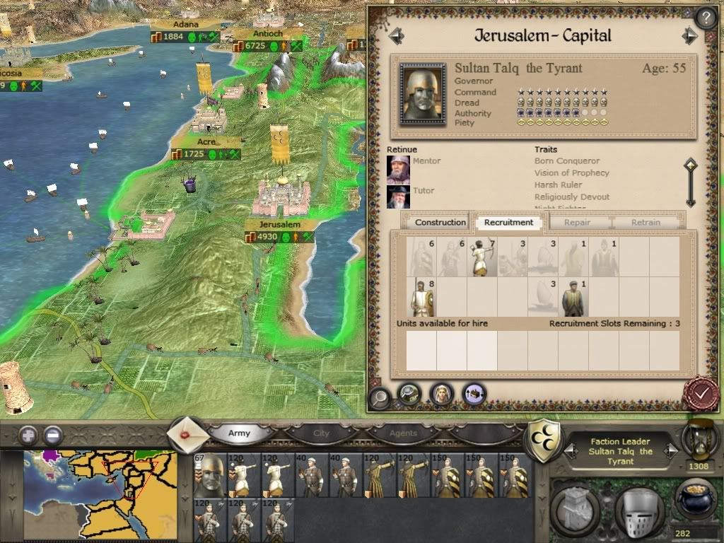 I remember Talq fondly. He had full dread despite a ton of chivalry traits and ancillaries, and ended up with maxed authority as well as the others. One of my more beloved little exterminators. None of his traits were "negative" in the way that they effected him, plus it was nice to groom him as he had the "vision of prophecy" trait. When Constantinople fell in 1308, the prophecy was fulfilled. The only faction he was merciful with was the Turks, who he accepted as a vassal rather than take their last settlement, then gave them a few others to strengthen them. Everyone else got put to the knife. And by everyone, I mean about 1,000,000 crusaders who continually poured in from North Africa, moving through Norman territory, as well as coming down through Anatolia and by naval invasion.