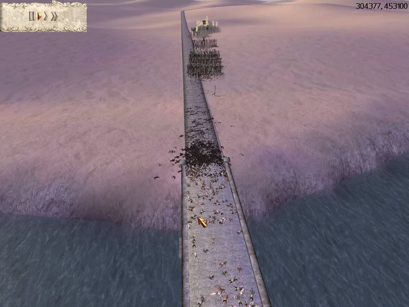 OK, so in my Germania campaign just now, I managed to lure a full SPQR army (the entire thing, reinforcements from Rome and all) across this shallow-water crossing (a bridge, essentially) using Illyrian mercenaries. On auto resolve, I was outnumbered 6-1 or something along the like, yet the SPQR still refused to go on the offensive. So I had the javelin mercs tease them over (all my losses stemmed from them). This huge army rolled into the bridge-area in a huge square. I unleashed my Berserkers, not sure of what to expect.