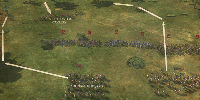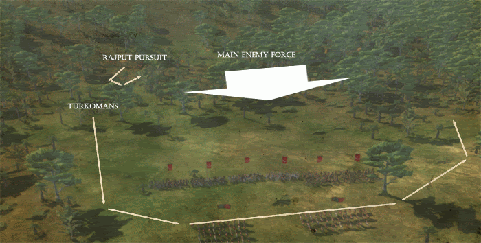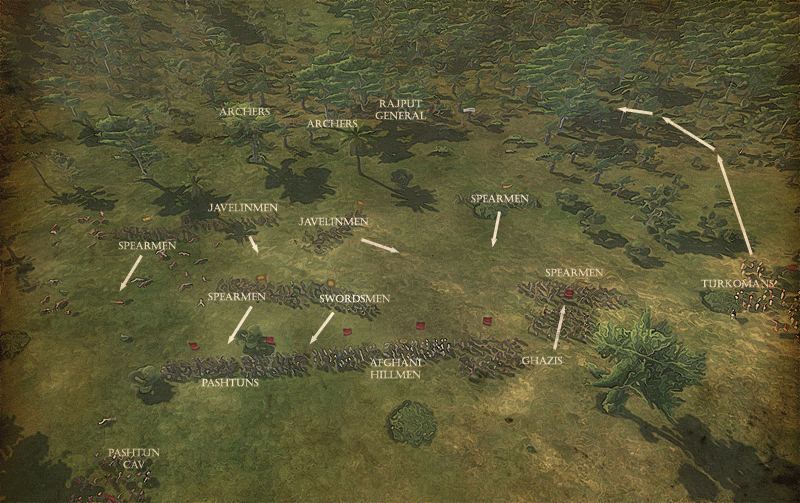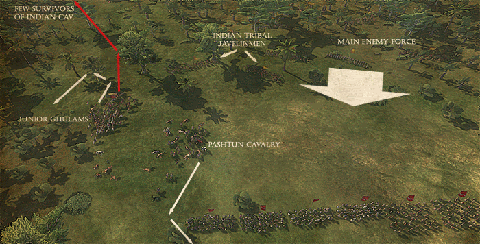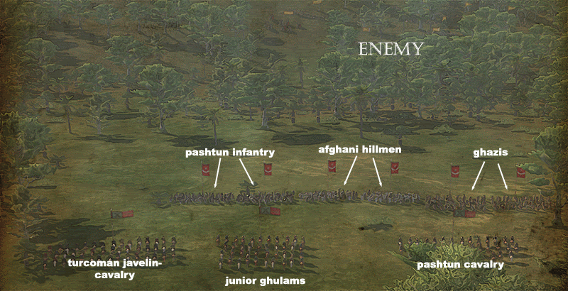 While Junior Ghulams can keep one of my flanks safe, I deployed Pashtun Tribal Cavalry to protect other flank. They are fast, lightly armoured horsemen, but they`re not using lances, thus their charging capabilities are limited to attacking light enemy infantry, or striking from the rear of enemy formation. On the other hand, they are excellent at pursuing broken enemy.