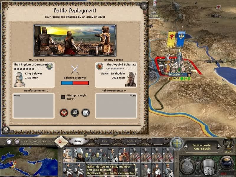 for once im happy something sort of historical happened battle wise. My determined soldiers under the command of Baldwin, who should have died of leprosy long ago, and Balian de Ibelin vs Saladin. A great battle with a pretty good conclusion
