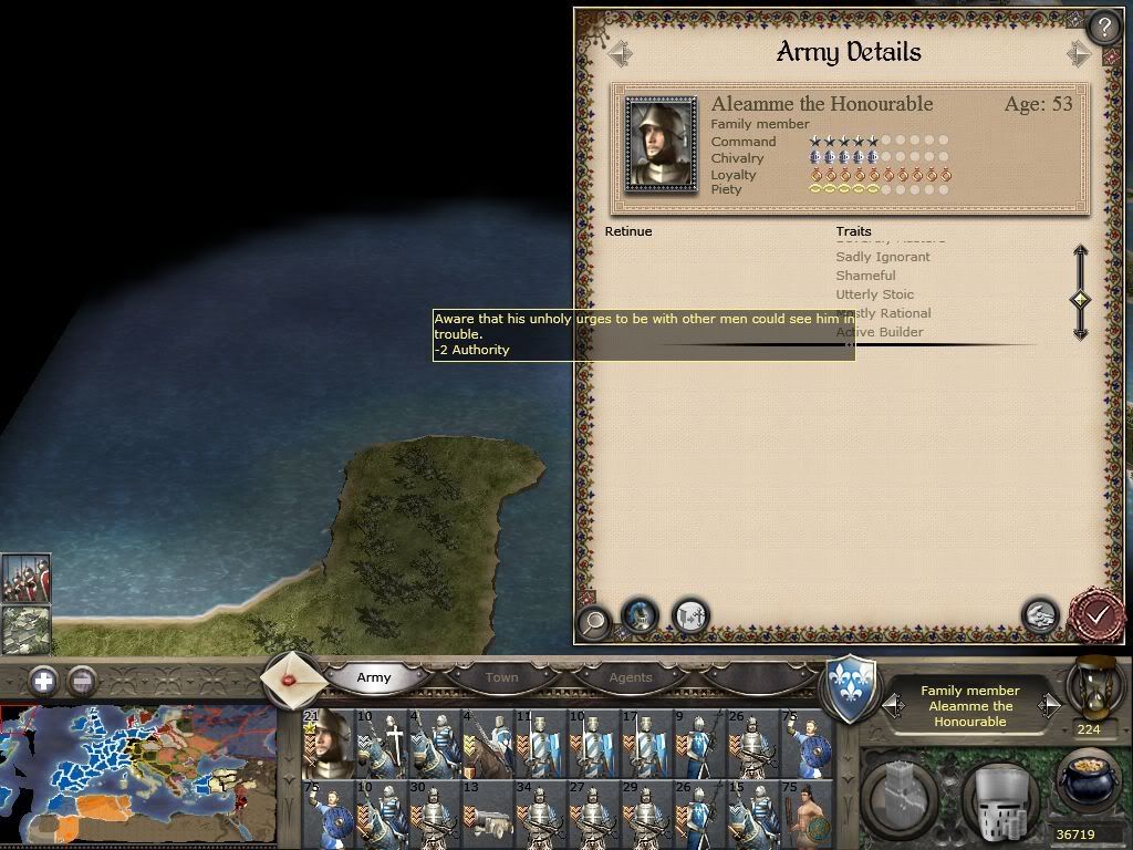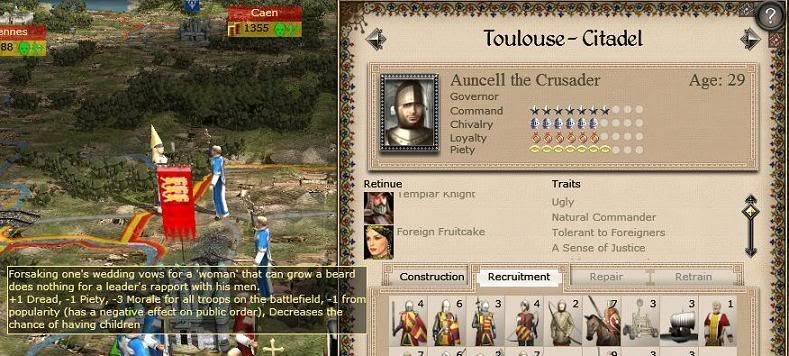 For winnining the Crusade, my ugly general gets both a knights templar and a knights hospitalar added to his retinue as well as the chilvarous ruler trait. All told, my 25 ish general has 8 Command and 7 Chilvary. Nice. The next round a French General with 2 crummy spear militas lays siege. I guess he just wanted to prevent me from building or something. After completely obliterating him, I got the usual trait increase along with a retinue increase. Clicking on the retinue pop-up I... what? Foreign Fruitcake. Oh Lord. So my Crusading champion celebrates a victory by hitting on the bearded lady. This coupled with his extreme ugliness means I can say goodbye to any chance of heirs. At least he's not like his brother the hypochondriac. Then I'd have to put him in front of my ballista during a live fire excercise. The English have terrible genes.