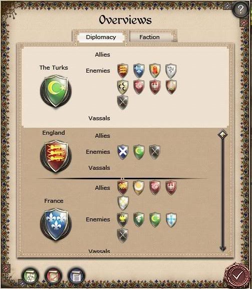 I've been playing vanilla 1.3 off and on for about a year now and I still haven't been able to finish a campaingn. Something to do with the 10-12 factions all declaring war on me within a turn or two like it's the latest craze. I thought I had a good thing going in my Turk campaign. I was amassing a huge force to crush Egypt and was on my way towards glory when Egypt demanded I become their vassal. Decline. Attack city. End turn. Then they demaned it again. And again. For TEN SOLID ROUNDS Egypt demanded I become their vassal. Stupid stupid stupid. Around this time a Crusade against my capital along with the Mongolian invasion sucked the fun out and I started yet another campaign.