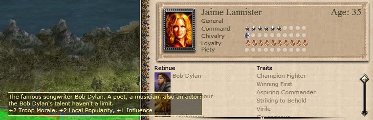 added in world\maps\campaign\imperial_campaign\descr_strat.txtCode:{bob_dylan}Bob Dylan {bob_dylan_desc}The famous songwriter Bob Dylan. A poet, a musician, also an actor: the Bob Dylan's talent haven't a limit. {bob_dylan_effects_desc}+2 Troop Morale, +2 Local Popularity, +1 Influence