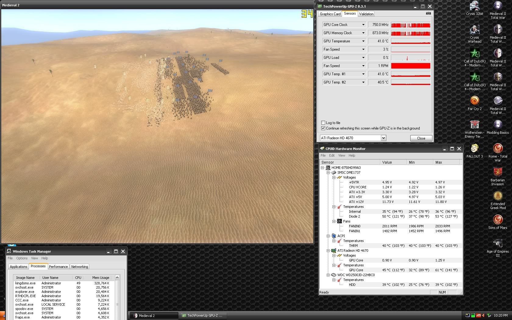 That was a 6000 man battle with settings (except the res) I said above. Now I have to admit that at the initial clash the FPS was 4, but it improved as men started to die. At the end of the battle there was 3000 men left over, so I was getting 30 FPS with at least 3000 men. One of things that shocks me is the GPU load when the game is running at 30 FPS.Spoiler Alert, click show to read: