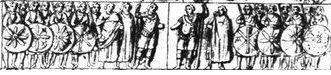 The next pane shows the Emperor Arcadius flanks by his advisors and probably guard infantry, note the large round shields with the 'Chi-Rho' designs. The infantry are shown unarmored, not unusal for Late Roman depictions of Guard Infantry. Arcadius is watching trophies being placed symbolically at his feet, the next two panes below.