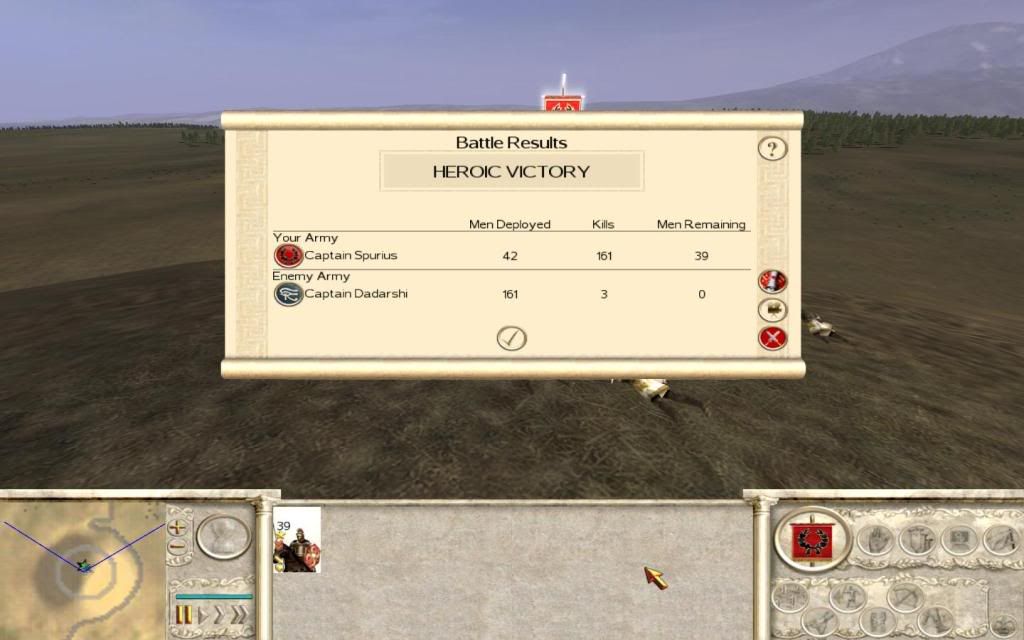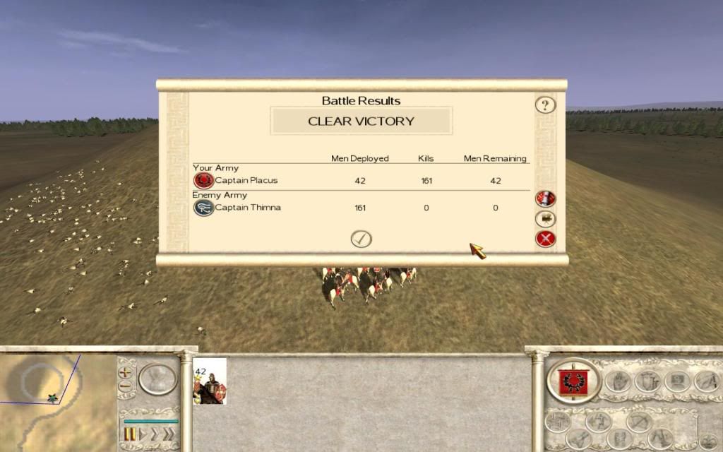 Did a quick test in custom battle using the normal circumstances I would have in my campaign. Gold weapons and armour and 2 experience. Yes I would think twice about attempting this in a campaign without min silver, but as your General in the Custom battle has less men than on the Campaign map (avg for me is around 52, huge units) I put on the full upgrade. Typical scenario, 1v1, general rides out on his own from a nearby city to squash a 1 unit rebel army, typically an archer unit, in this case Nubian Archers with 2 exp, as you will find on the campaign map with spawned armies. Alt-fire charge, bowmen dead. I was surpised not to take any casualties, normally I would expect around 3-5%. This is on Medium difficulty just to clarify, I'm happy thereOh, he gained an exp in the fight, missed that in the battle.
