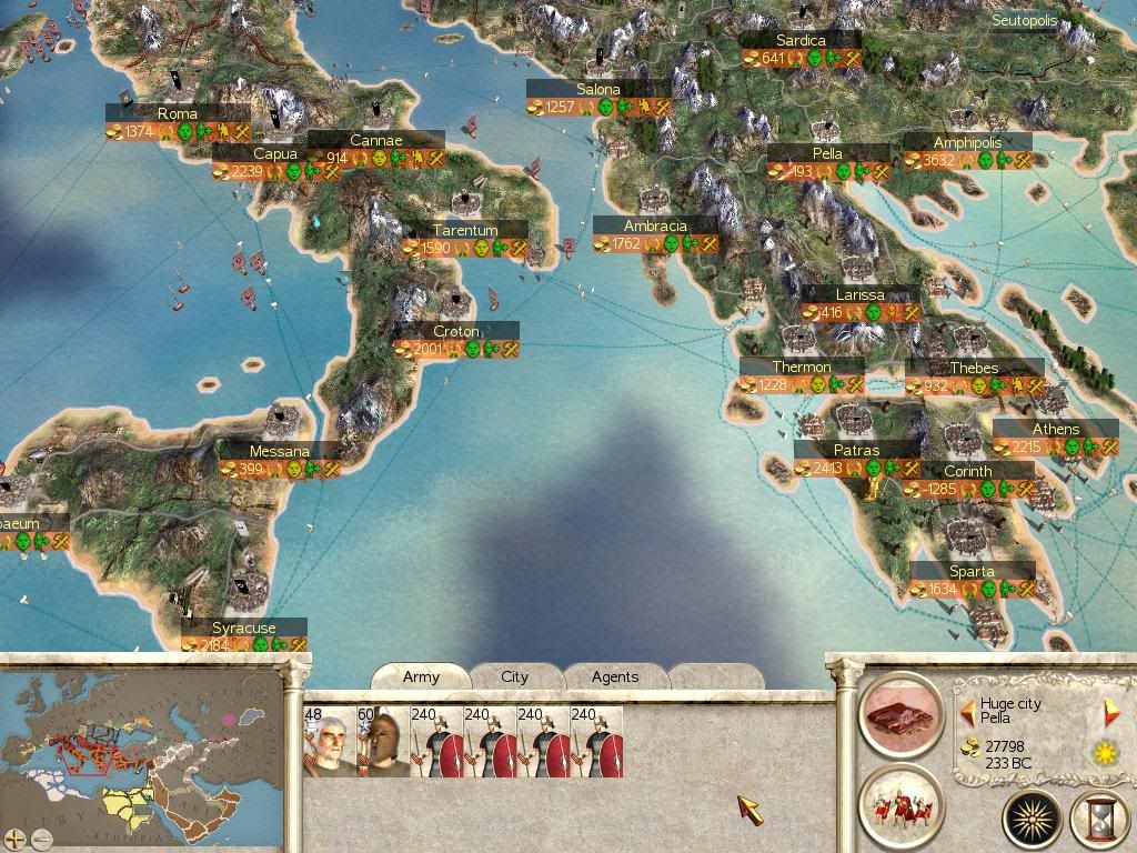 I have been doing things a little different to I normally do in my campaigns and am having results which are very unusual for me. I have occupied 90% of all cities conquered with 2 being exterminated and 1 enslaved because I needed to move on quickly. Also I have not as yet (I think anyway) invaded territories which are in my allies starting spheres of influence, if there is such a thing that is, only exception is I have Lilybaeum(sp?) in Sicily. Now, I have an alliance with Thrace that I have had since turn 1 and it has held. A short time later I got one with Germania, and again that has never been broken. Carthage broke it's alliance with me but later asked for a new one. Bactria joined in alliance with me as did Pontus the turn after it quit it's very brief alliance with TSE.