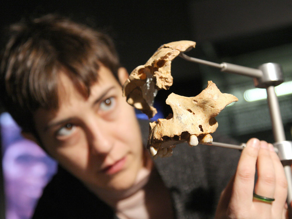 An archaeologist sets up pieces of an 800,000-year-old human skull found in the Atapuerca hills for a museum exhibition in Paris