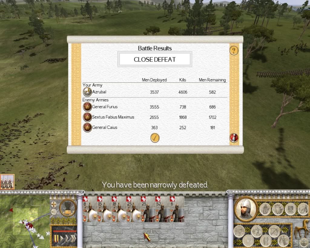 Yes, I lost. The first army was easy to take out, but then the second army arrived on the field and pushed my infantry line to the brink of collapse. Meanwhile, my elephants were ambushed by some Velites and routed. After that, it was pretty much over, since the elephants were so vital to winning the battle due to their intimidation alone. My men fought tooth-and-nail to win, and despite their inevitability of defeat, they managed to push through the Roman line and kill the Roman FL just before routing...