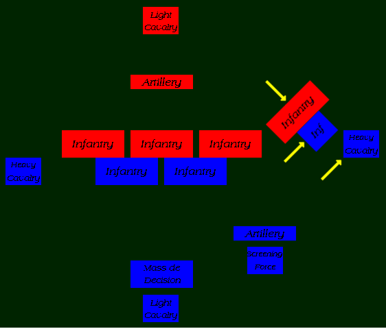 Infantry units that have penetrated the gap and/or the hvy cav remaining on the right side are used to rout your enemy's left flank.