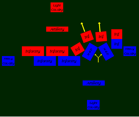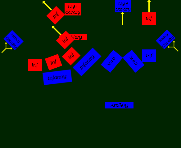 The remaining hvy cav are now moved up to either attack the flanks of the enemy line and roll them up, or to charge any units that are remaining in the rear.