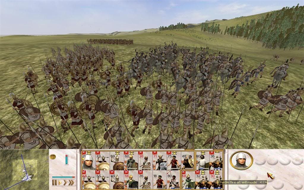 Hannibal deployed the Army of Carthage on a low rise, and watched the first enemy force march straight towards him. They would first have to pass through some woods in the middle of the battlefield. Meanwhile the Messana garrison was approaching on his left, but was still some distance away. Hannibal had already predicted the first line of attack, and his peltasts were hiding in the forward edge of the woods, with orders to attack the ballistas if they passed by.
