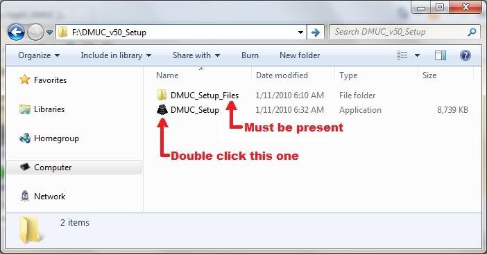 Now, extract the DMUC Install Files folder to temp location. After extraction has completed, browse to the DMUC Setup folder, you should have the following: DMUC_Setup.exe, and a DMUC_Setup_Files folder. Both items MUST be present!