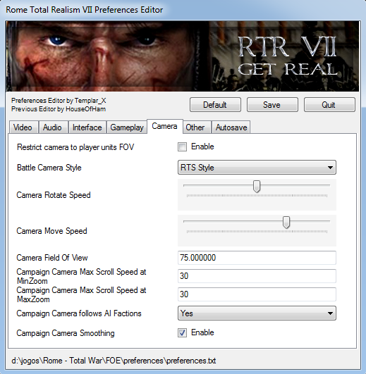 This is a small application that allows you to easily change the settings in the preferences.txt file. Setting are divided by several categories (Video,Audio,Interface,Camera,Gameplay,Other) for easier access with more intuitive names and values.