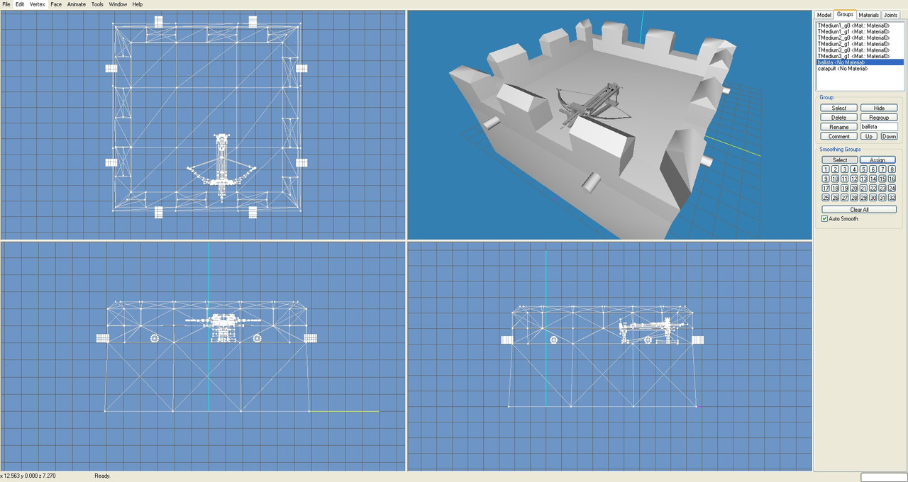 So to get one tower top in game - in milkshape - identify which structure it's in - write to milkshape, edit it and it's subsidiary groups, bear in mind if it was an upgradeable tower the next two objects may also be part of the tower, representing the upgrade levels. Keep the group names the same and when you replace the structure using IWTE it will keep all the original firing slots and recognise that it's a tower etc. If you've changed the shape a lot create a new collision for all of the objects using the IWTE buttons. If you've changed the positions you want the firing to come from a lot you need to change the firing slots using IWTE buttons.