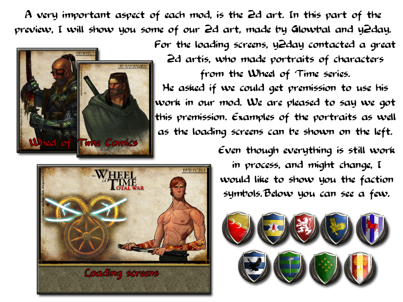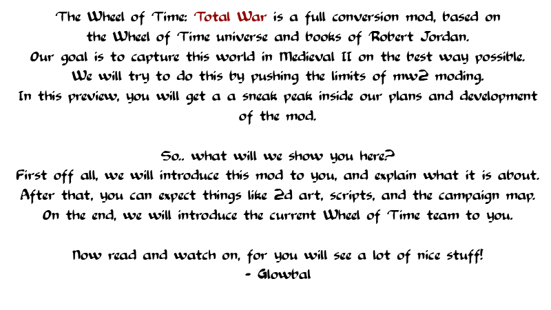 I must be a bit of a bummer here and suggest that it probably isn't the right time to make this mod. Firstly, when (or if) the Empires modding tools are released, that game has much more in terms of versatility to mod with, even if the vanilla game isn't my cup of tea. Secondly I just don't feel the Wheel of Time is a popular enough series to warrant interest. The Lord of the Rings fullfils most players Fantasy needs, one just needs to look at the Song of Ice and Fire mod. Its little far from being dead along with a host on none fantasy mods.