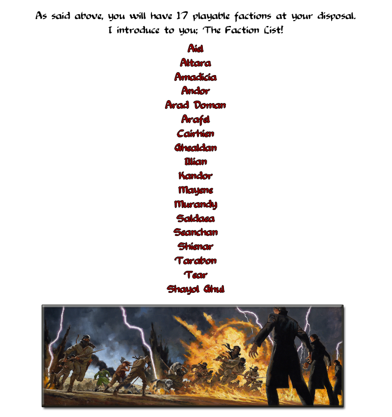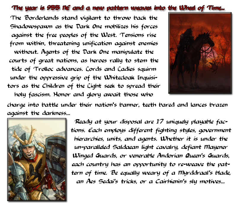 As for the variety of cultures, you're quite right. However, I feel that for simplicities sake we could make roughly three groups, The "Southerners" The Borderlanders, and then Exotic. However, we could then refine it further, using the three groups as a base, the foundation so to speak, and adding variations as we know them. For instance, Sheinar which is the Borderland nation we know most about, could be used as a base-line adding nation specific units as we know them, such as Arrafellin having two swords. And use Andor as a base, and so on. Though exotic will be more tricky, as obviously we can't use Aiel as a base for Seanchan or the Sea Folk.