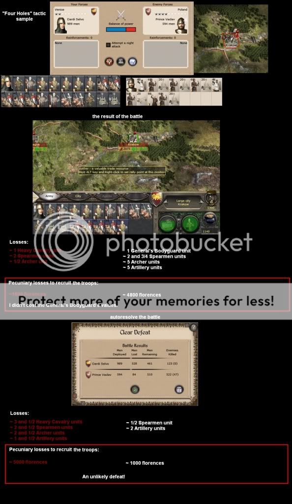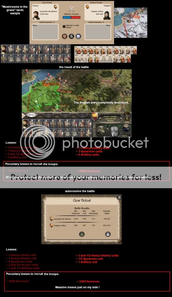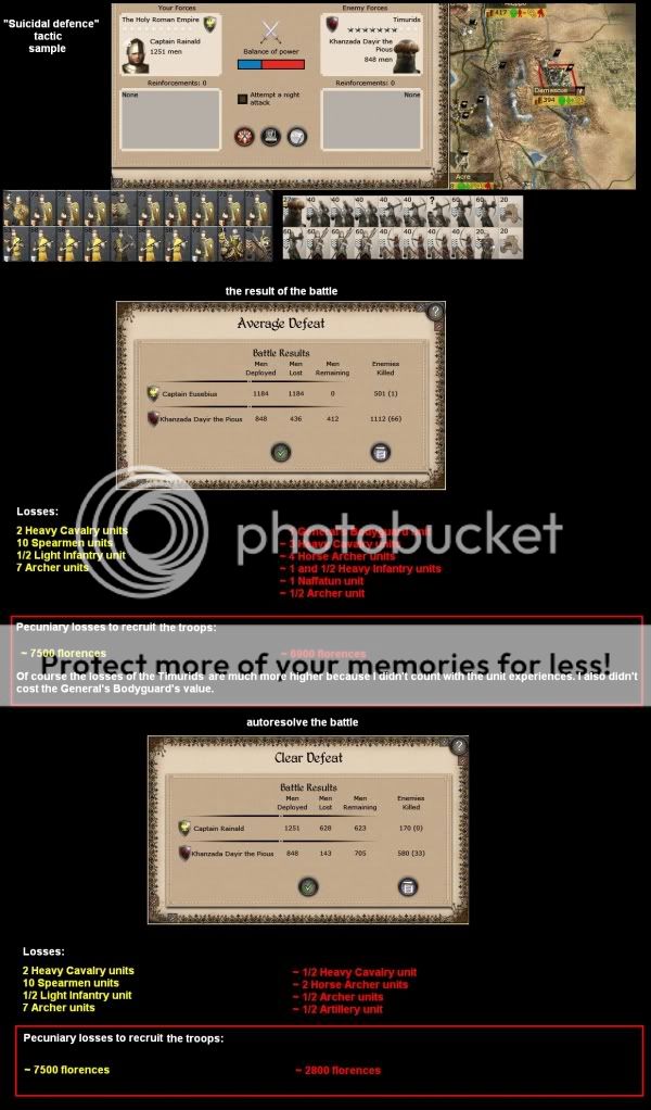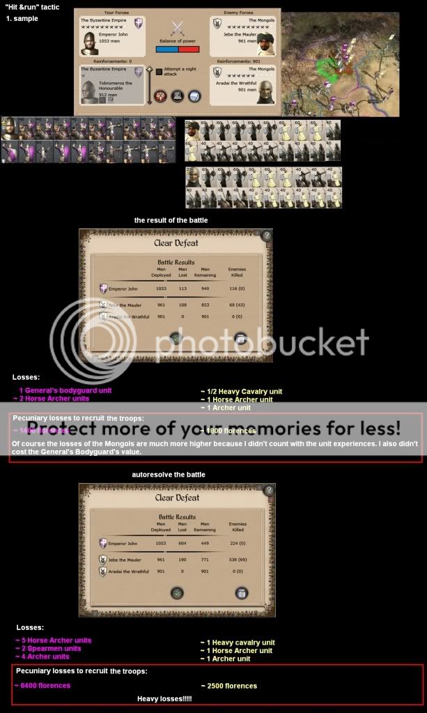 In the second sample as you can see I attacked twice a full Mongol army and caused heavy losses. The terrain was advantageous and I sacrificed some Spearmen and Archers for the bigger effect. To autoresolve these battles would have been disastrous.