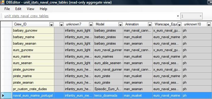 Then you need to open DB Editor and use it to create a table each of the following: "unit_stats_naval_crew_tables", "warscape animated lod tables" and "warscape animated tables". Open the "units_stats_naval_crew_tables" and select the row that contains the marines for the US. Copy it, and then go to "File< Create new unit_stats_naval_crew_tables". You will be asked to either enter the tables into a new mod file or an existing one. Choose new and give it a name.
