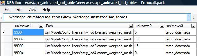 For example, here is the row controlling the textures of the Portuguese marines on ships in Naval Battles. In the "Model" field, enter the name of your custom texture. Mine is called "TercodoArmada" and I made it in Photoshop. Then go to File <Save. That saves that table to you new mod.Next, open the "Warscape animated tables" in DB Editor and click "File< Create new warscape_animated_tables" and choose to insert it into the same new mod as the last new table. There will be three columns. In column one, type the name of your texture file (without the diffuse/normal/gloss endings), and in column 2, type the path to the file (i.e. UnitModels/Textures/nameoffile. Then click File<Save. One more table to go. Next, open the "Warscape Animated Tables" and create a new table and again choose to put it into your new mod file. There should be four LOD (level of detail) model files - either custom mesh files that you imported in your mod's "UnitModels" folder or an existing default model in the game. You need four lines. In the "Path" column, type the path to your model (not the texture but the LOD files - unlike last time) as shown below. In the "Unknown 3" column, type the filename (without the diffuse/normal/gloss file extensions) of the texture you want to apply to the model.The pictures you have seen are how I did it to change the Portuguese marines to those below, which are more historically accurate than those in the game:
