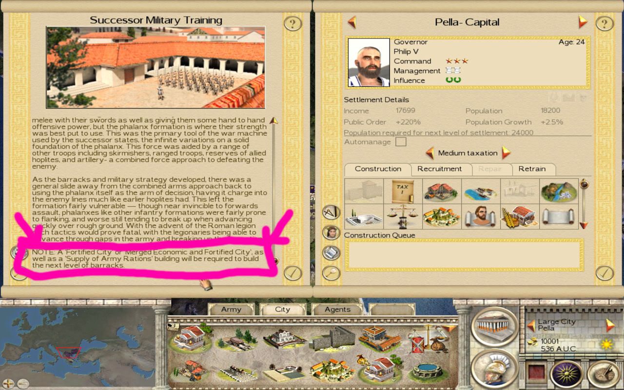 It tells you the requirements in the bottom of your current barrack. The only thing you need in Pella is a supply of army rations.