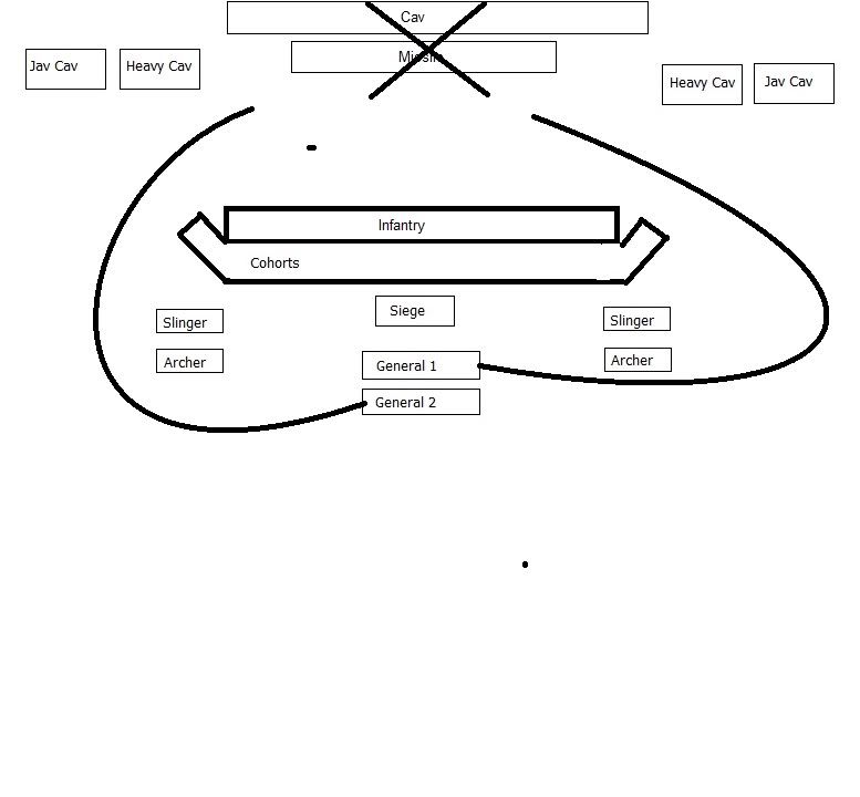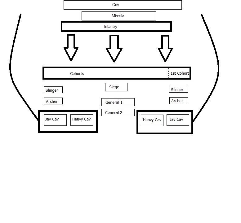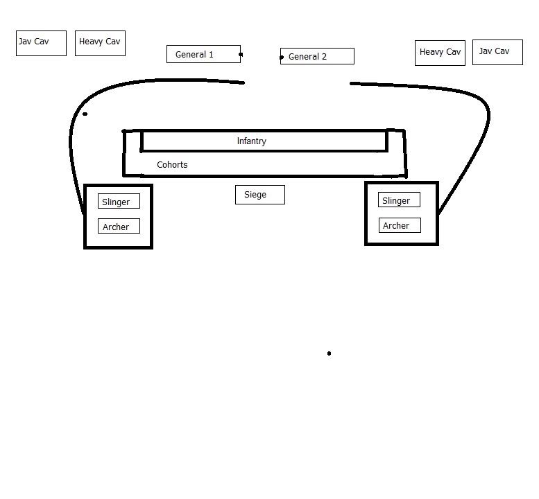 Cohorts are lined up in a basic line formation. This weakens the middle, but unless your opponent spams elite pikemen down the middle (which has happened one or twice), your line will always hold. Putting units in guard mode is something I still have to experiment with, I find that it tends to cause more casualties, so I usually only have the units in front of the siege artillery on guard mode.