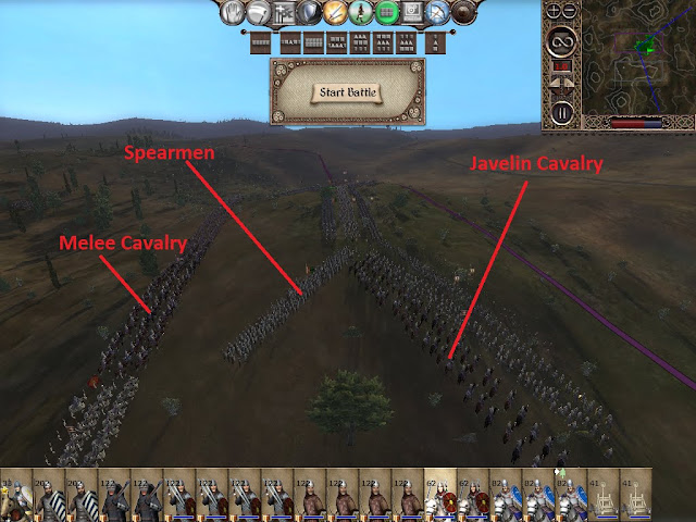 This is a side view of the same thing. You can see the javelin cavalry are already set up for a flank attack, and they are ready to counter the inevitable enemy flank. Also note how the spearmen are protecting the flanks rather then holding the front line. Your not just preparing for a flank attack, your expecting it.