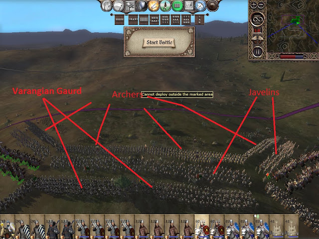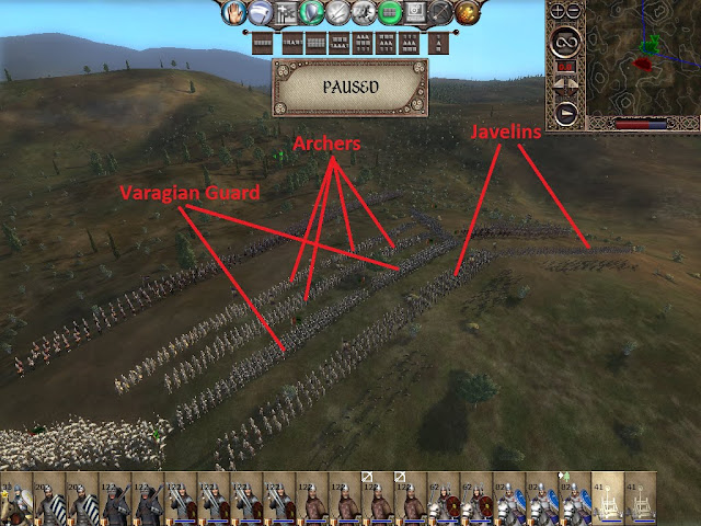 Now that the battle has begun some shuffling is in order. The archers run to the back where they are protected from cavalry charges from all 4 directions. The javelins run to the front, and are set to guard mode. The varangian guard move up just a little bit. They have just enough space to get a charge bonus against anything that attacks the javelins.