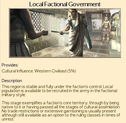 Gauls, Carthage, and the Greek Cities have a trait system of social climbing. This will trigger with normal conditions in Extended Culture 4, but will use the senate system in the Senate campaign. This feature will be expanded to all factions in future versions.