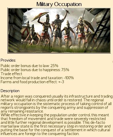 Each faction has their own way to develop socially and economically in history, and your governors will enforce it in settlements if conditions are right. One faction will have about three policies that can be adopted, which differ from faction to faction. This feature will compensate governing handicaps on taxing of many factions.