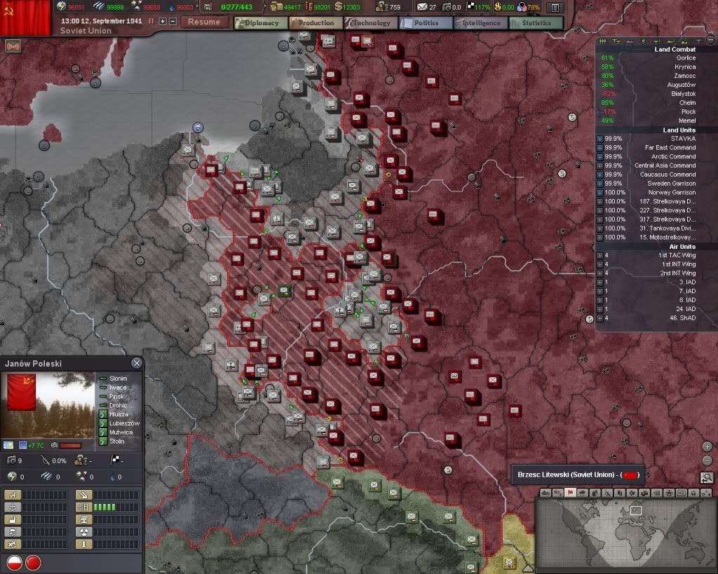 For the fight against Germany I intend to use a heavily mechanized breakthrough army to punch a whole in the center of the front (the Ukrainian plains), holding the line with full-infantry armies everywhere else. My goal is to have one full (5 div) corps per frontline province by the time the show gets started. At the moment the frontline is about 75% full and should be complete by 1941. After that I intend to build a strategic reserve or to begin staffing the Far East, depending on what seems to be the most pressing problem. Can I count on Hitler staying nice until June 1941 or is he about to jump me?