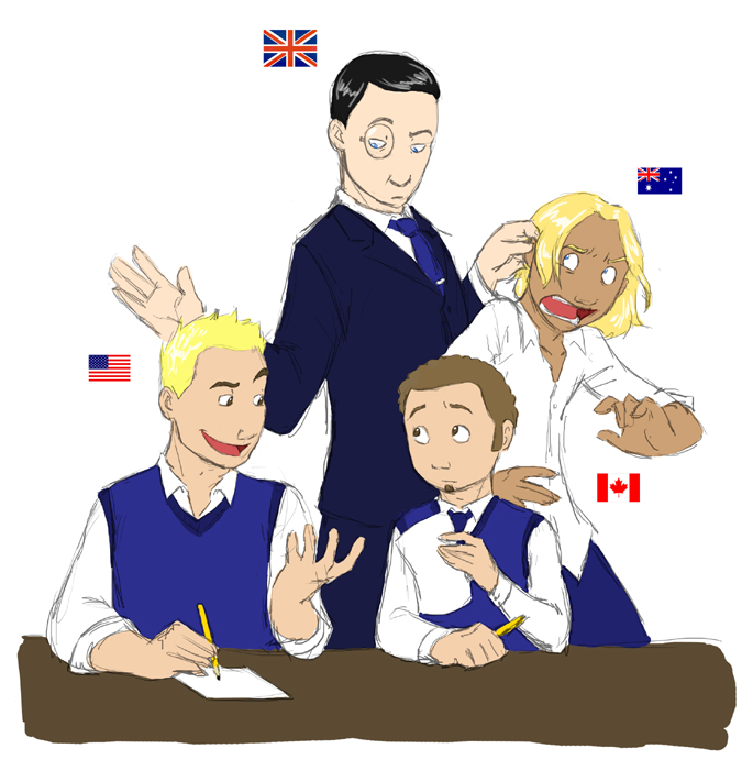 The twins Australia and New Zealand are the youngest. Australia and New Zealand are best of friends despite being very different. Australia looks up more to his oldest brother and despite his small size is vicious in a fight, while New Zealand mostly wants to be left alone to read his fantasy novels. They are both close to their older brother the US, even though they claim he is always getting them into fights.