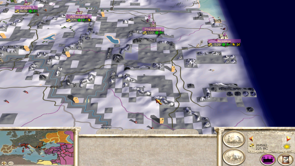 Here's the scene, campaign map, after 4 battles (I counted), at the end of the 4th, the game minimizes showing two thirds of the desktop blacked out, but showing the taskbar and some of the desktop (lower right hand corner and a different coloured taskbar). Shortly after the game maximises and I continue. This comes across as a warning kind of, as at the end of the next battle the game minimizes to the desktop same as before, but a message pops up with Windows 'searching for a problem' - after which you have to close the program.