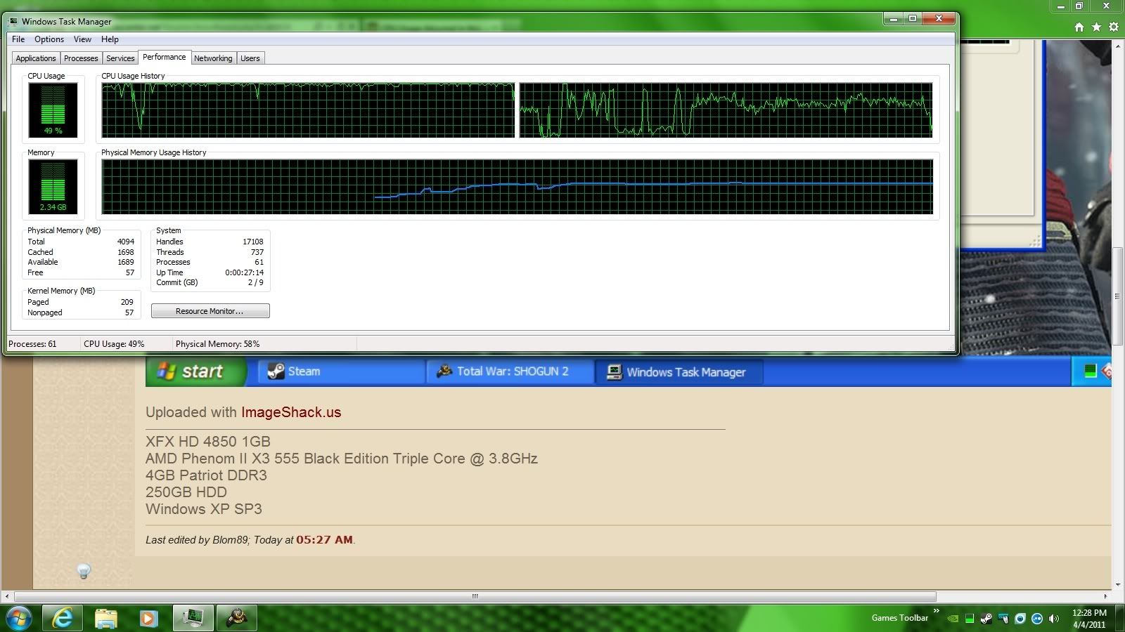 This was during a 13 vs 13 Unit battle @ high settings WHILE UNITS WERE FIGHTING with large Unit sizes at 1024x768...at like 12FPS, not playable at all. I Had Task Manager running before even running Shogun 2, so I was able to screenshot immediately: