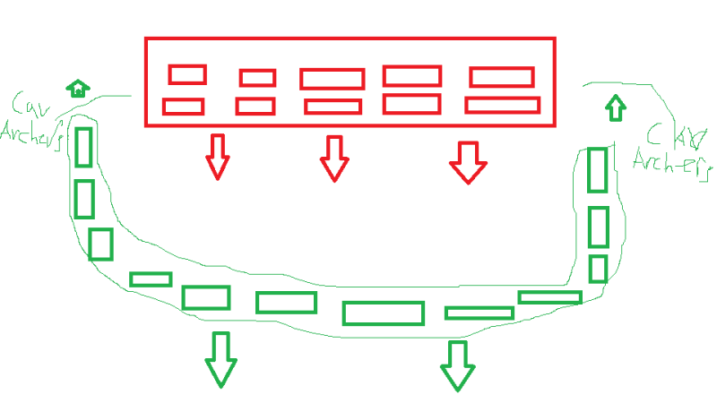 Of course, doing it with horse archers makes a lot more sense. I usually do that when using a full HA army, except I have more of an L formation, and my general is on the wing so he can attack their archers and artillery with some HAs if he gets a chance.