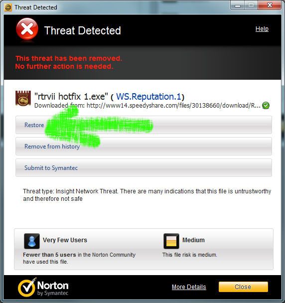 I get the Norton problem with the RTR VII.exe & hotfix also.