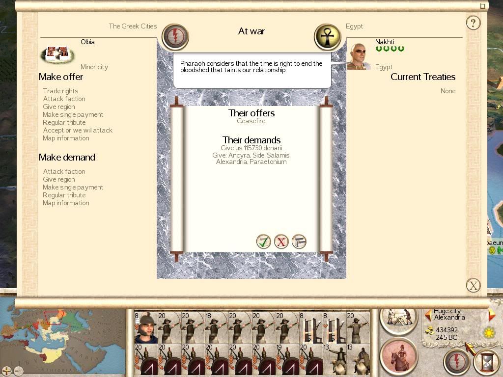 In a related event, I once offered to buy every single one of Egypts cities (~225bc) and they wanted in return my entire treasury (which at the time was something like 200,000). So I did. And they did. Thats how I conquered the Nile. And thats a money machine.