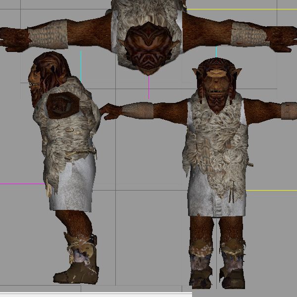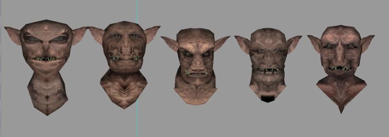 I'm back to work on this mod, thought I'd show my basic orcs, complete with custom skeleton for proper forward hunch. I'm expecting that this model may provide a useful base model for ogers and hill giants. These are roughly based on The Orcs of Thar cover.