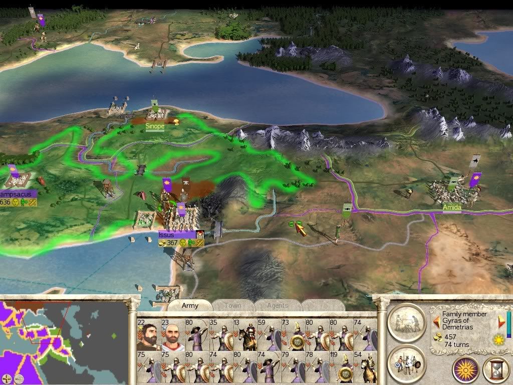 I started off with one stack (Alexander) and struggled with money, as i took my first cities and went down to egypt the gits stole them back. Hence why i had to go back up before moving on. By this time i had a second stack!!! I used this as a cleanup (taking back cities, killing rebels and small annoying armies) this stack was used to destroy illyria. I continued with good momentum only sieging near empty cities in an attempt to avoid sieges and stick to the battlefield. i used a semi circle (and even a full circle a few times) of phalanx units and stuck cav in behind for most battles. With my other stacks it was more a straight battle line with peltasts behind. As you can probably see (if you can follow the real route of alexander and my expanded mini map) that the route i took was interestingly similar (well the start at least). I really enjoyed the campaign. Some battles became a bit tedious and i was gutted i didnt fight the indian elephants in the campaign but oh well.