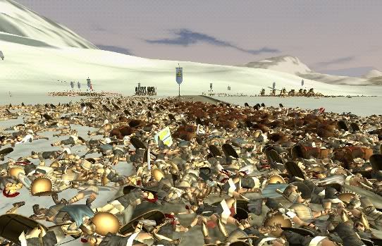 Roman and Epirus soldiers lie dead in the ground after the defeat and annihilation of the armies of Augustus.