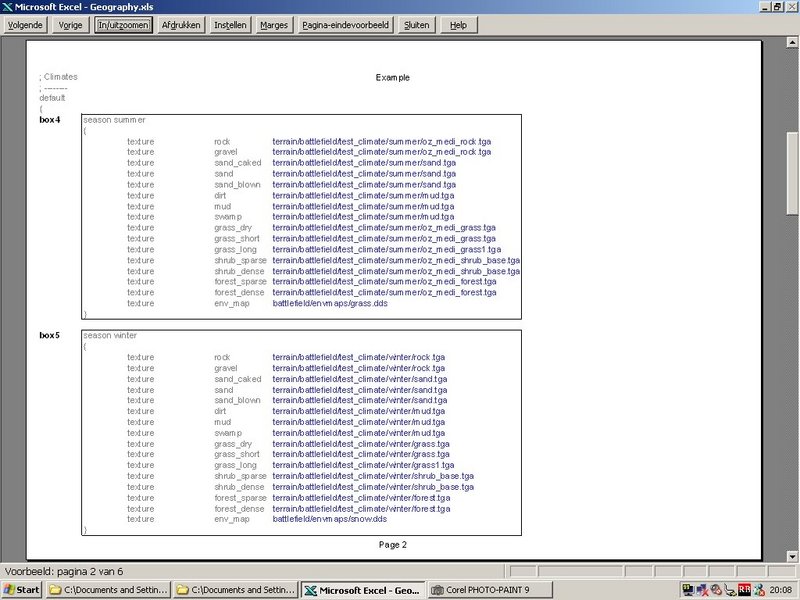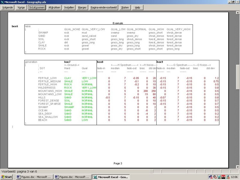 The result is illustrated in Figure 4. As you can see, the Sparse Forest summer textures indicate uniformal grass coverage. Odd as this may seem for a ground type "sparse forest" this is indeed the intended effect. In figure Figure 7 box 7, we find that sparse forest has a hardness "shale" and quality "normal". When we consult the table shown in Figure 7 box 6, we find that the ground type distribution is centered on a "grass_long" gridcell. Remember that in the .db file rows and columns are numbered from 0 to 5, so the coordinates of this gridcell are 4(row) by 3 (column). These are indeed the numbers (in byte format) found for Sparse Forest in the .db equivalent of Figure 7, box 7. Beware that different climates can have different "lookup tables"! The tables themselves, it seems, cannot be modified.