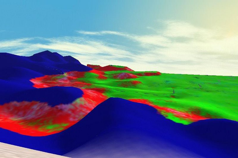 The result of loading the game with these settings is shown in figure 13. Steep areas now have rock textures with some mud interspersed. The footslopes and hills are covered mostly by grasses, though shrub and forest textures cause some mottling here. The gradient coincides with the sequence of texture types specified in the fifth row of the table in figure 7, box 6. Textures found in steep areas are found on the left, those found on flat slopes on the right.