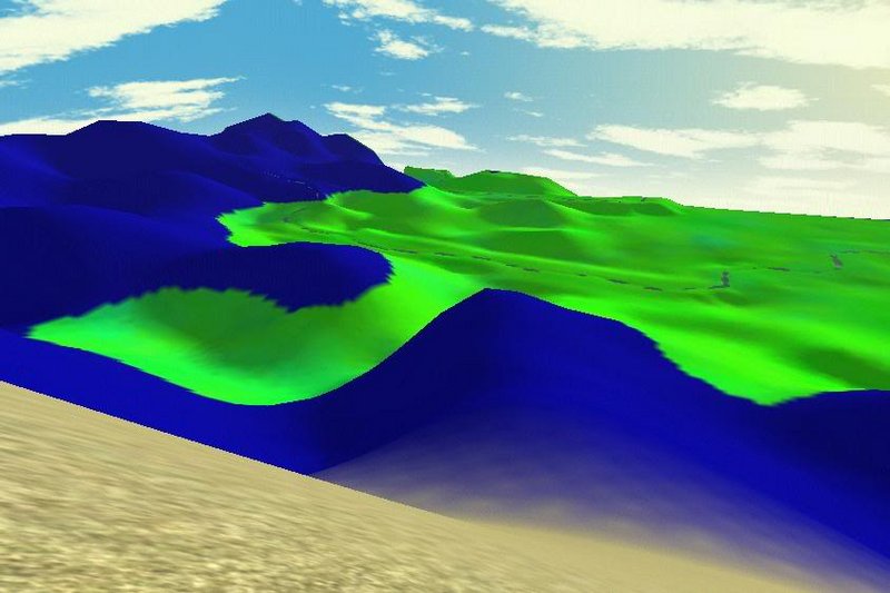 Next I stripped away as much of the relief detail " gained in translation" as possible. The result is shown in figure 3. To put the crown on my destructive work, I also removed the game's own contribution to texturing the battlemap and replaced it with "legend" colours. In figure 4, Blue is used to depict winter colours, while the summer colours are bright green.